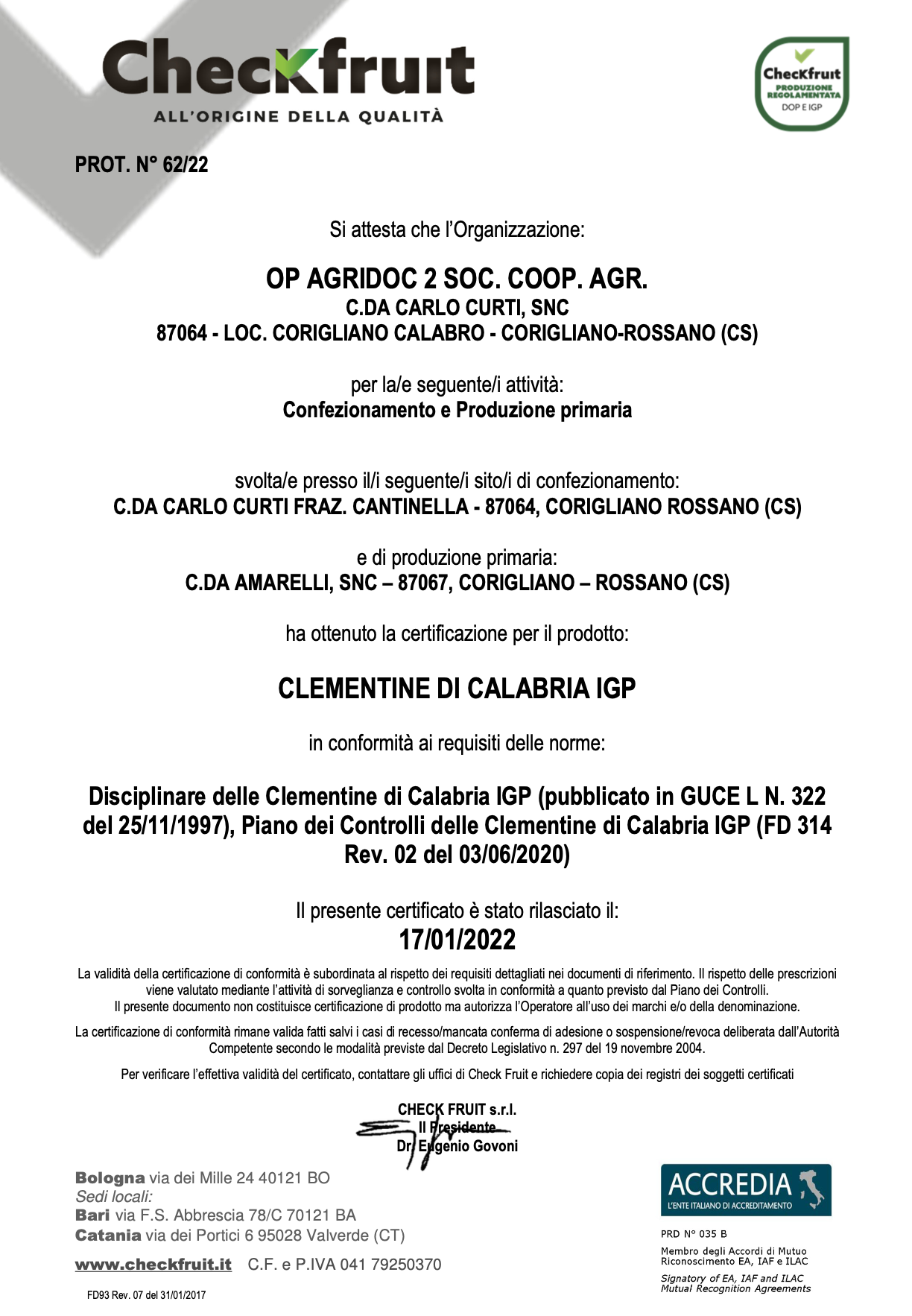 Attesta la conformità dell’azienda alla produzione e confezionamento delle “Clementine di Calabria IGP”, garantendo l’aderenza ai requisiti di qualità e alle norme del disciplinare di produzione.
