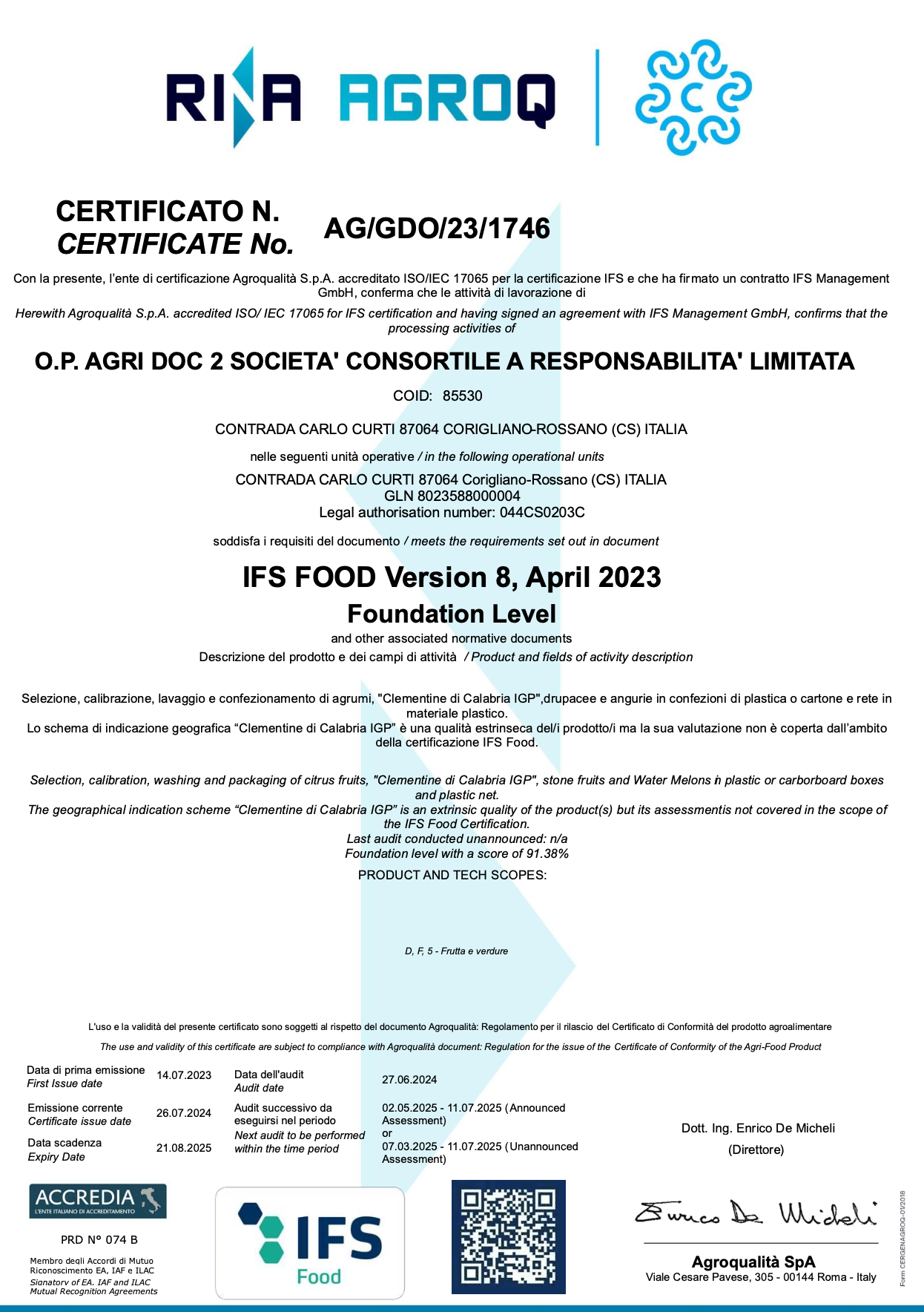 Garantisce la sicurezza e la qualità dei processi produttivi dell’azienda, in particolare per la selezione, calibrazione, lavaggio e confezionamento di agrumi e frutta, con un punteggio di conformità del 91,38%.